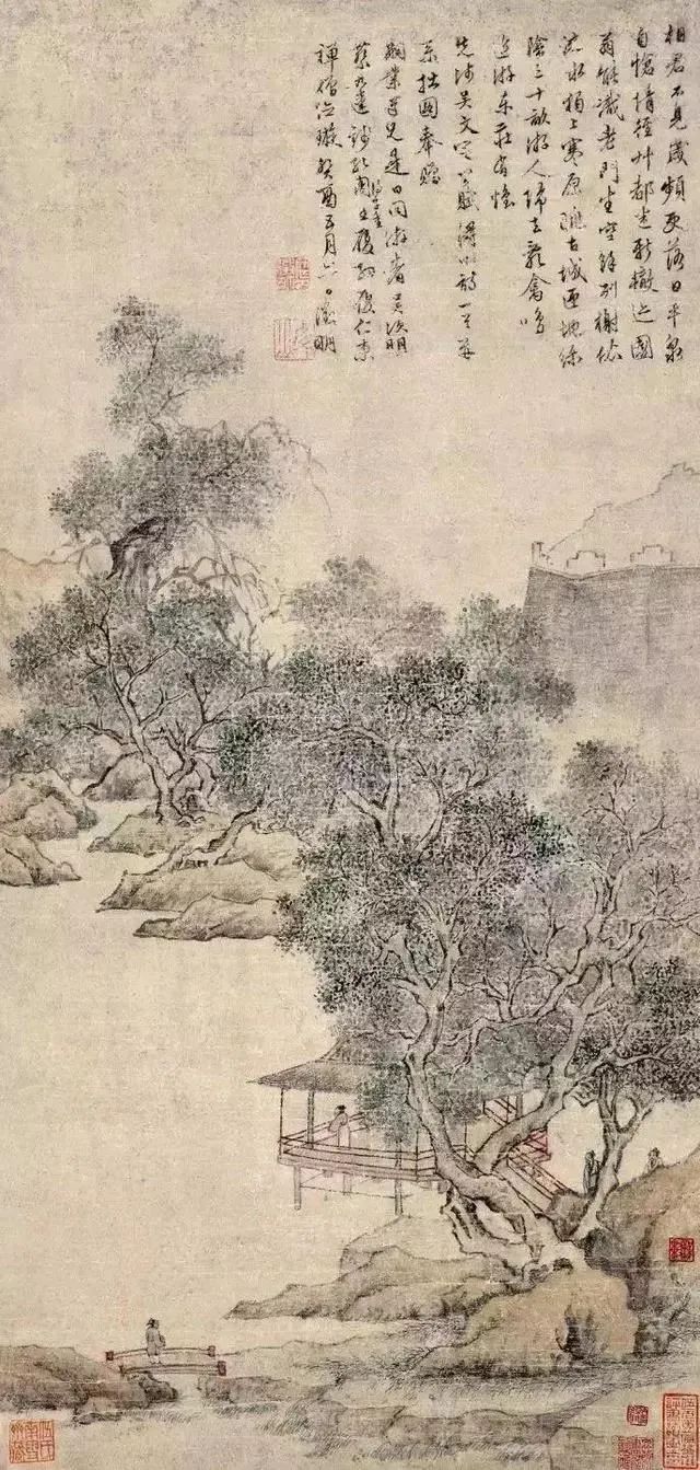 文徵明的作品主打“细笔山水”,这是他的骨子画。他天然师从沈周,却并未受沈周雄强野蛮的画风所覆盖,反而偏疼妍丽、细润、端淑一说念的山水,在他的笔下,长久皆是行吟、烹茶、不雅泉、歇凉的调调,看他的山水画,总能给东说念主一种欢然的、静好意思而关心的“幸福感”,令活命在当下参差皆市的咱们,找到一个静谧的休恬之所,千里浸在这田地清幽、高雅的画卷中,偷得“浮生半日闲”!