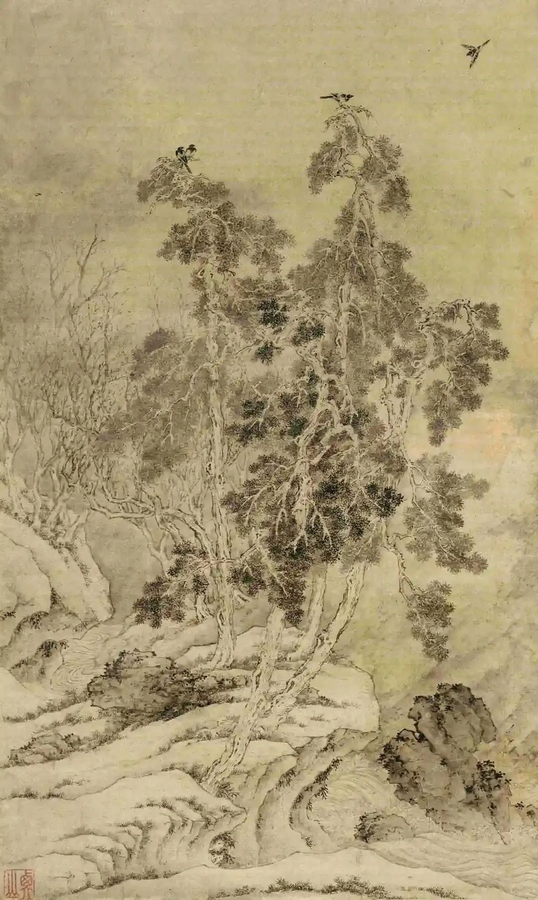文徵明 古柏归鹊图